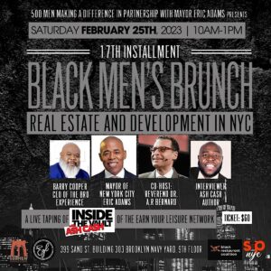 The 17th Installment BLACK MEN’S BRUNCH by admin | Posted on February 22, 2023February 22, 2023 50 MEN MAKING A DIFFERENCE In Partnership With MAYOR ERIC ADAMS Presents he 17th Installment “BLACK MEN’S BRUNCH” 399 Sand St Building 303 Brooklyn Navy Yard 9th F Saturday February 25th 2003